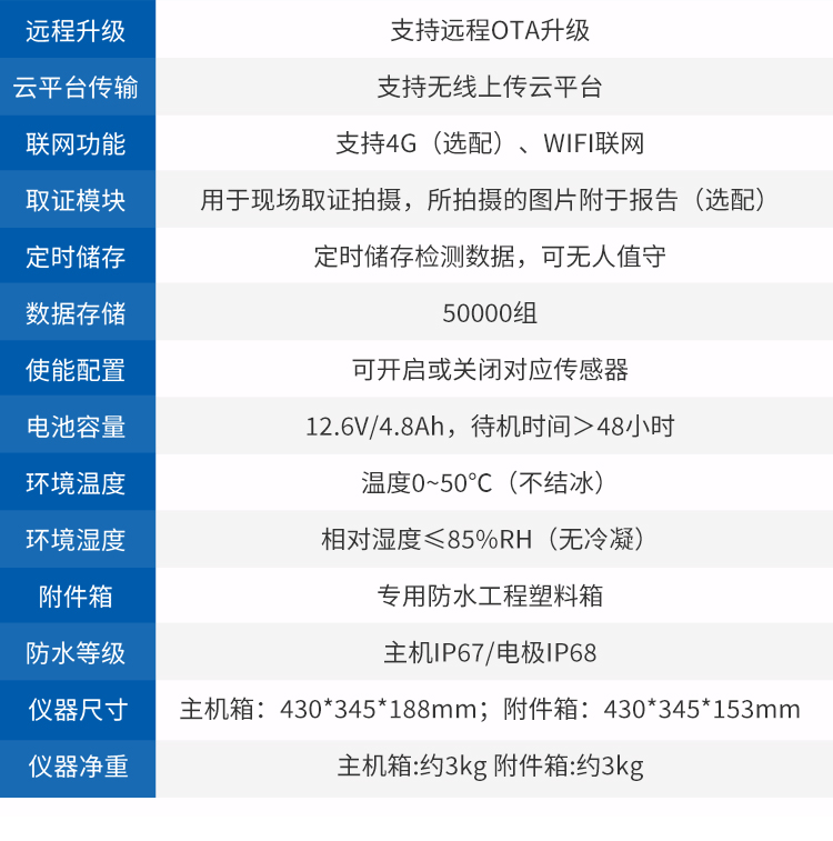 3.可測量水體中的pH、ORP、濁度、余氯、溶解氧、電導率、溫度、懸浮物、污泥濃度、葉綠素、藍綠藻、COD、氨氮、氯離子、硝酸根指標,并同時顯示結果;